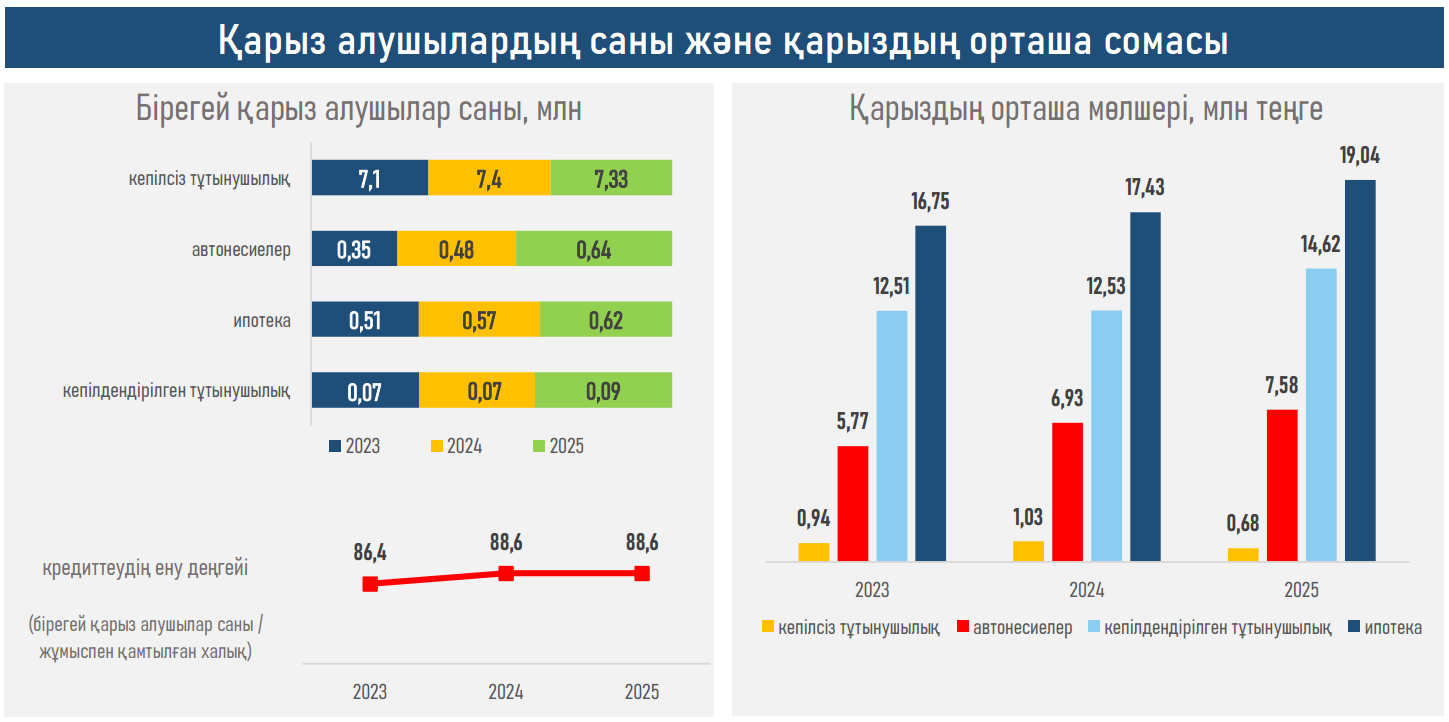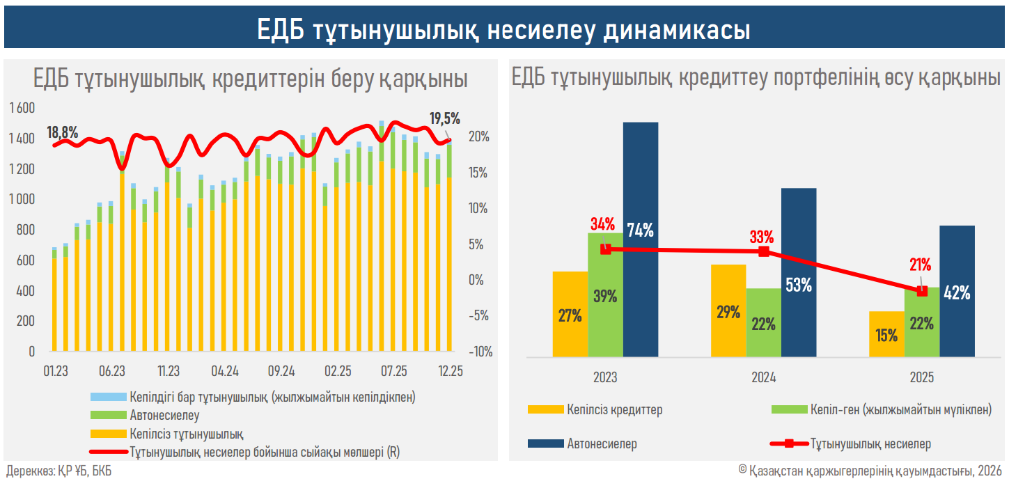 - Сонымен қатар, ипотека (ж/ж +9,2%), автонесиелеу (ж/ж +41,8%) және кепілді тұтынушылық қарыздар (ж/ж +77,1%) сияқты өзге сегменттерде оң динамика сақталды. Бұл нарықтағы сұраныстың қамтамасыз етілген өнімдер пайдасына қайта бөлінгенін айқын көрсетеді.
