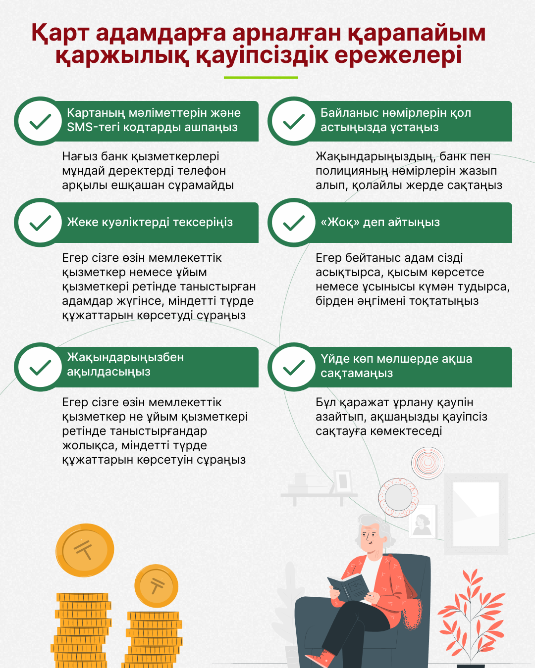 - Егер күмәнді қоңырау болса, телефонды қойып, ресми нөмір бойынша банкке қайта қоңырау шалу керек екенін айтыңыз.