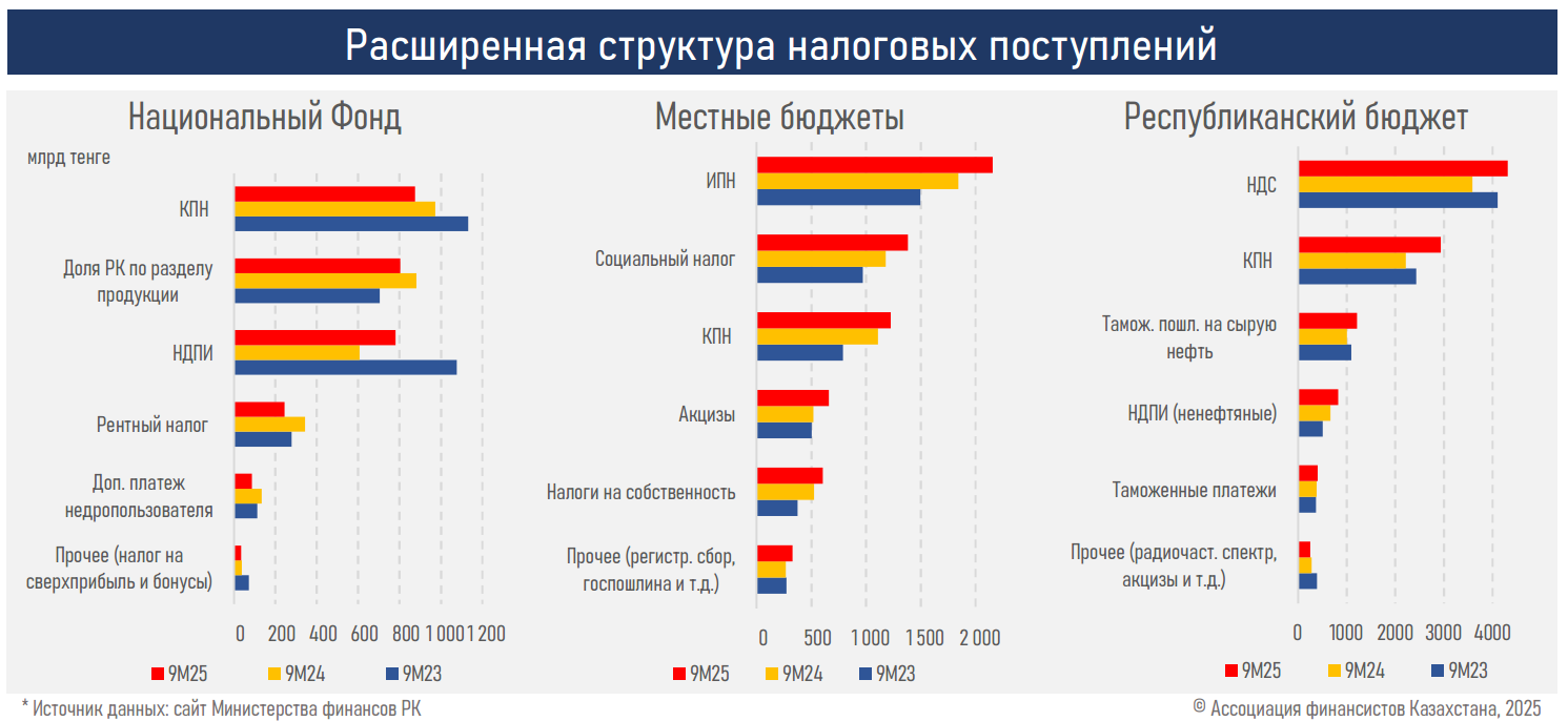 - В абсолютном выражении наибольший рост налоговых поступлений отмечается в республиканском бюджете (+₸1,8 трлн). Более 90% этого прироста приходятся на поступления по НДС (+₸727 млрд), КПН (+₸713 млрд) — индикаторы роста деловой активности и инфляции, а также на таможенную пошлину на нефть (+₸206 млрд) за счет увеличения её добычи (+13,2%, до 75,7 млн тонн).