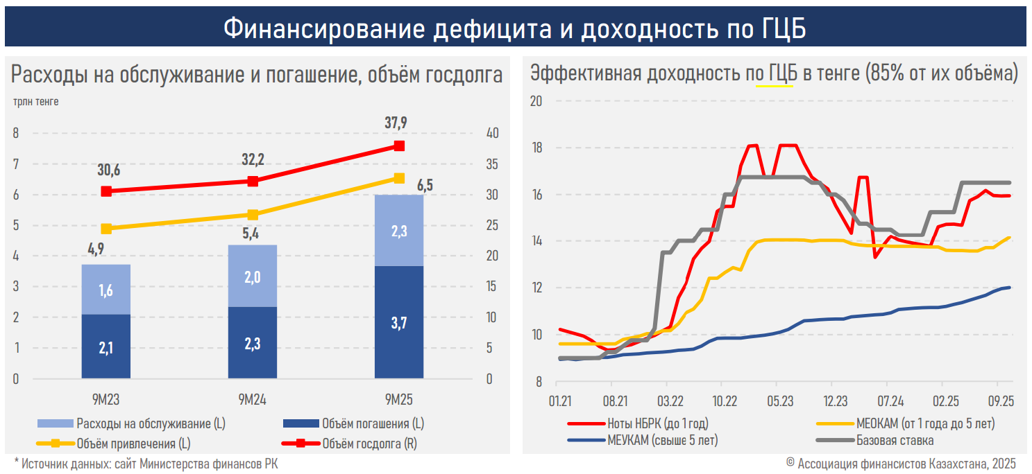 - Для финансирования дефицита было привлечено ₸6,5 трлн новых займов (рост на ₸1,2 трлн), что соответствует 75% годового плана в ₸8,7 трлн. В оставшийся квартал потребуется привлечь ещё ₸2,2 трлн заимствований в условиях более высоких ставок, что будет увеличивать стоимость обслуживания государственного долга в будущем.