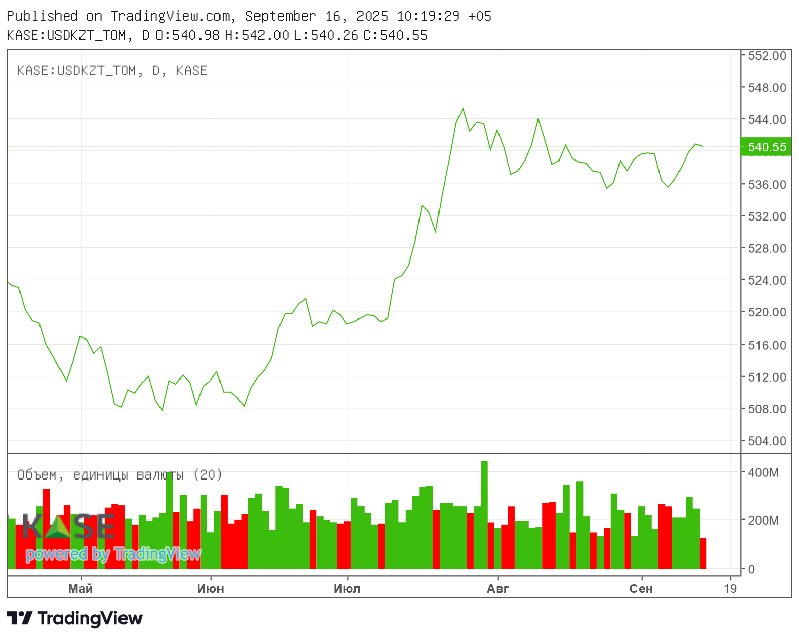 Курс по паре USDKZT в понедельник практически не изменился, оставшись на уровне 541,03 тенге за доллар (+0,19 тенге) при низких объемах торгов в 125,2 млн долларов (-121,9 млн). Поддержку нацвалюте могли оказывать такие факторы, как рост нефтяных котировок, повышенные объемы нетто-продаж инвалюты Нацбанком, экспортерами и субъектами КГС. Устойчивость курса отражает «временное равновесие», которое может измениться при колебаниях объёмов импорта и/или новых выплат по внешнему долгу.