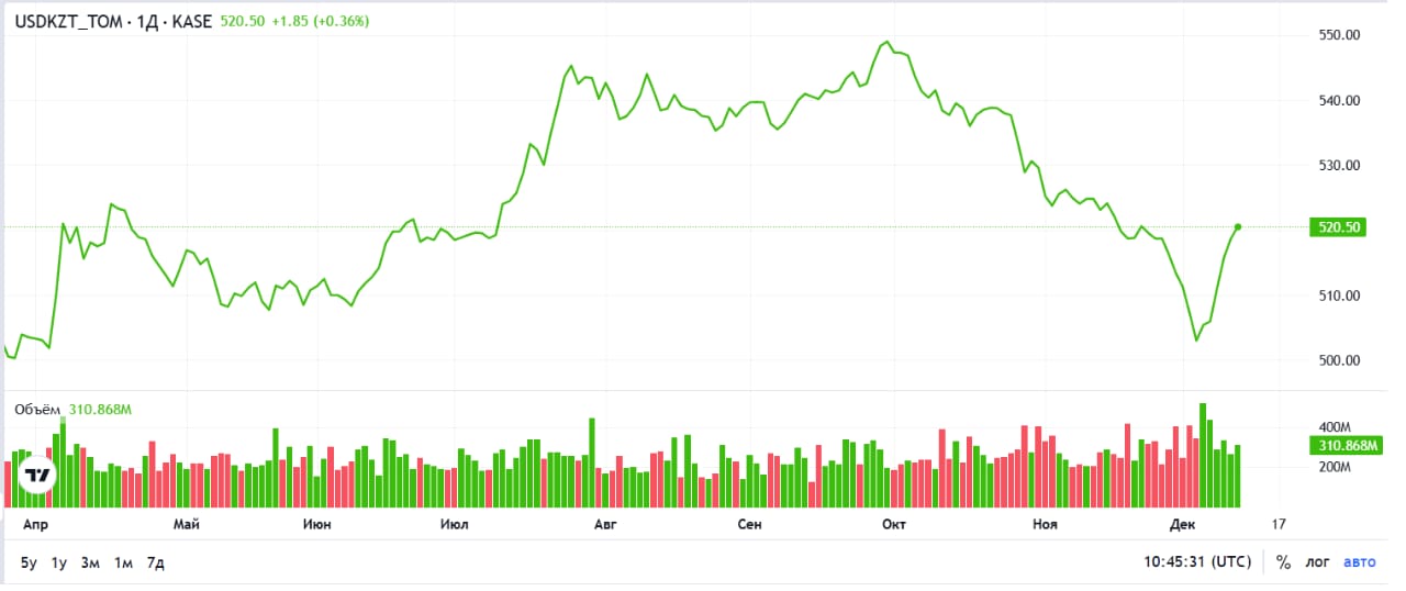 Доллар на KASE растёт уже пятую сессию подряд. По итогам валютных торгов четверга курс по паре USDKZT поднялся до 520,22 тенге за доллар (+1,94 тенге) при повышенных объёмах торгов в 310,9 млн долларов (+48,7 млн). При этом внешний фон складывается довольно нейтрально: котировки нефти вместе с индексом доллара показали снижение во время торгов. Вероятно, такая динамика объясняется совокупностью внутренних факторов, включая привлекательный курс приобретения инвалюты и разовый предновогодний спрос со стороны отдельных игроков валютного рынка.