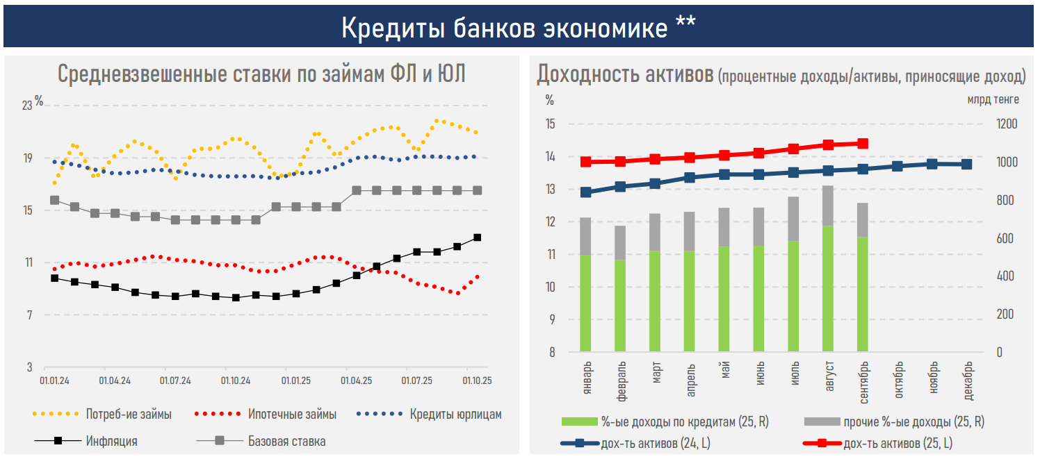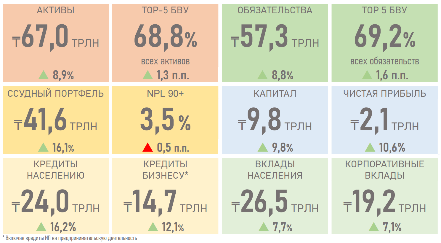 - Ужесточение финансовых условий, нормативов резервирования и макропруденциальной политики, а также волатильность курса тенге и предстоящий рост налоговой нагрузки замедлили выдачу новых кредитов.