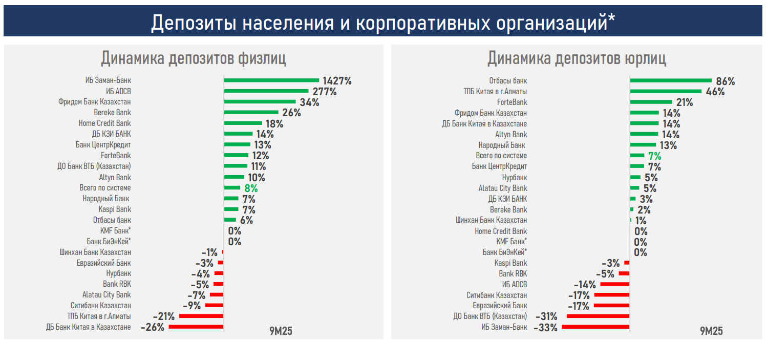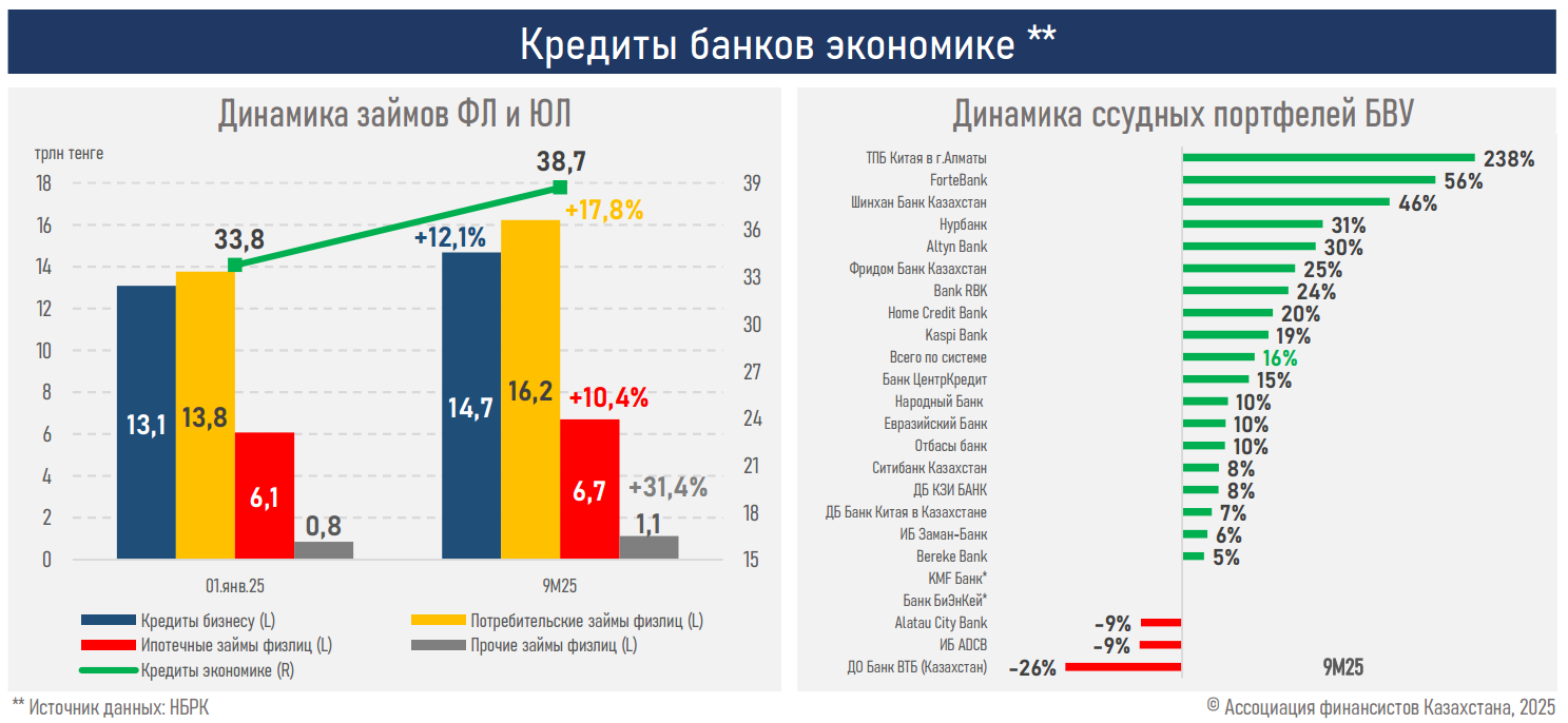 - За январь-сентябрь 2025 года в розничном сегменте прирост новых кредитов составил 12,8% в сравнении с показателем в 23,3% за аналогичный период 2024 года, в корпоративном — до 16,1% против 21,2% ранее.