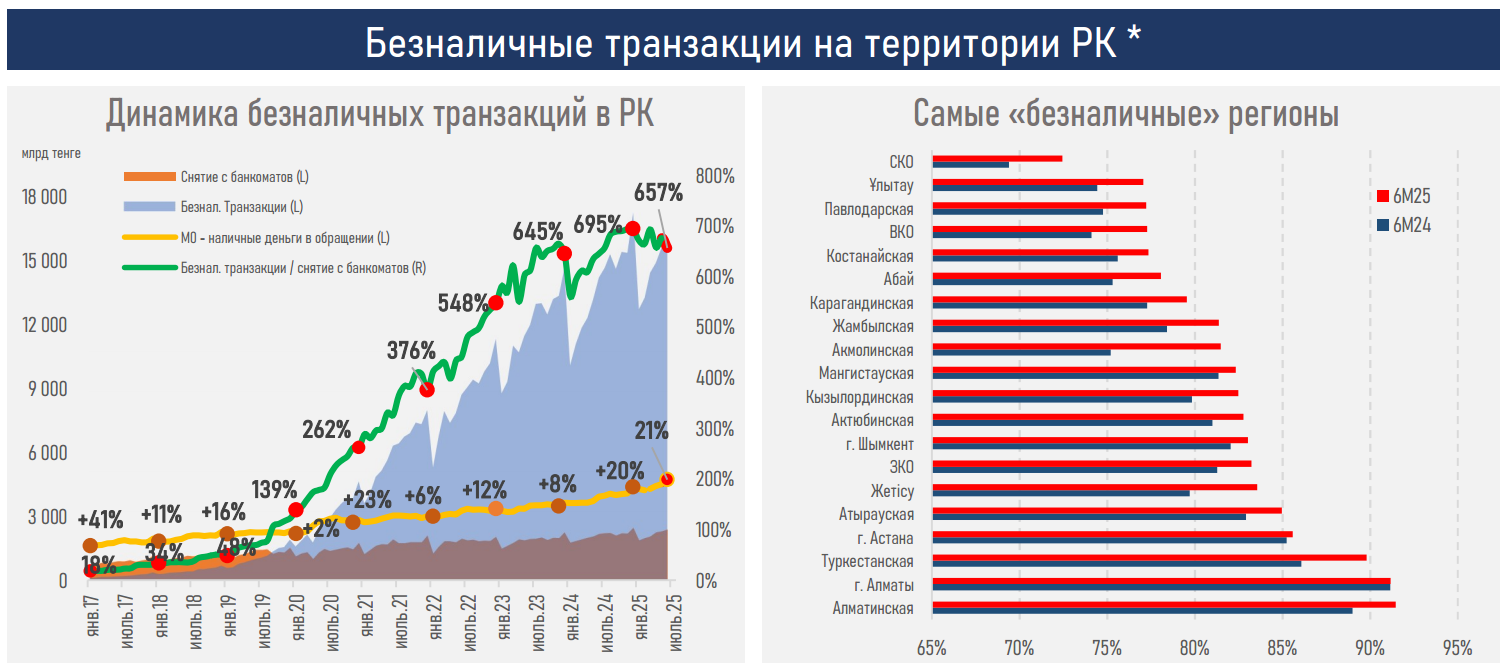 - Так, наибольший прирост доли безналичных операций зафиксирован в Акмолинской (+6,3 п.п.), Жетісу (+3,8 п.п.), Туркестанской (+3,7 п.п) областях, а также СКО (+3,0 п.п). Это свидетельствует о выравнивании цифрового ландшафта и снижении регионального «цифрового разрыва», который за год сократился с 21,7 до 19,0 процентных пунктов.