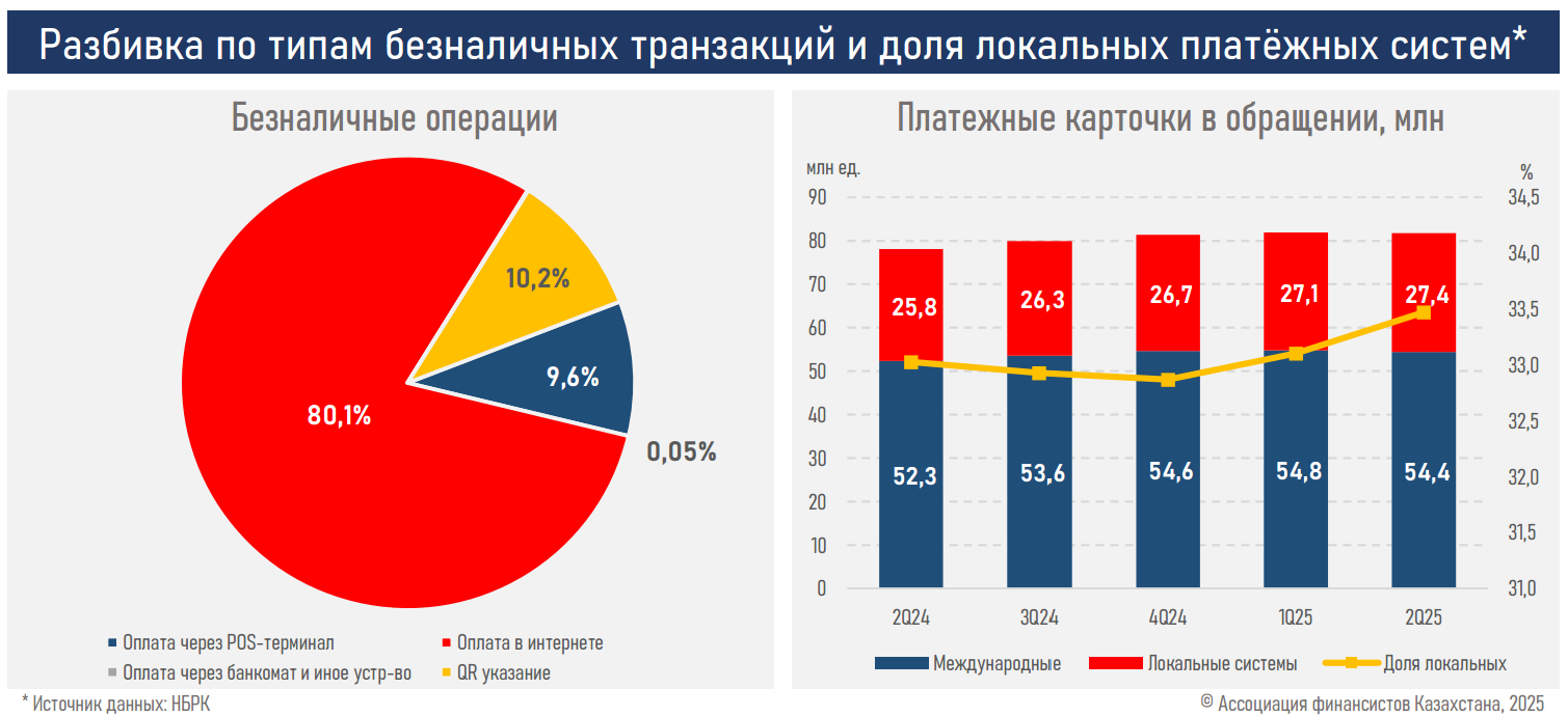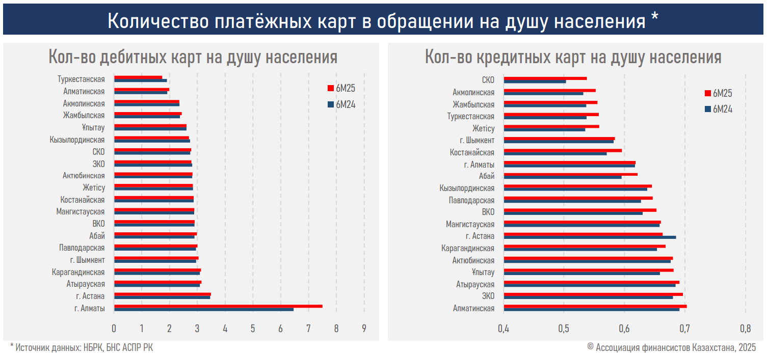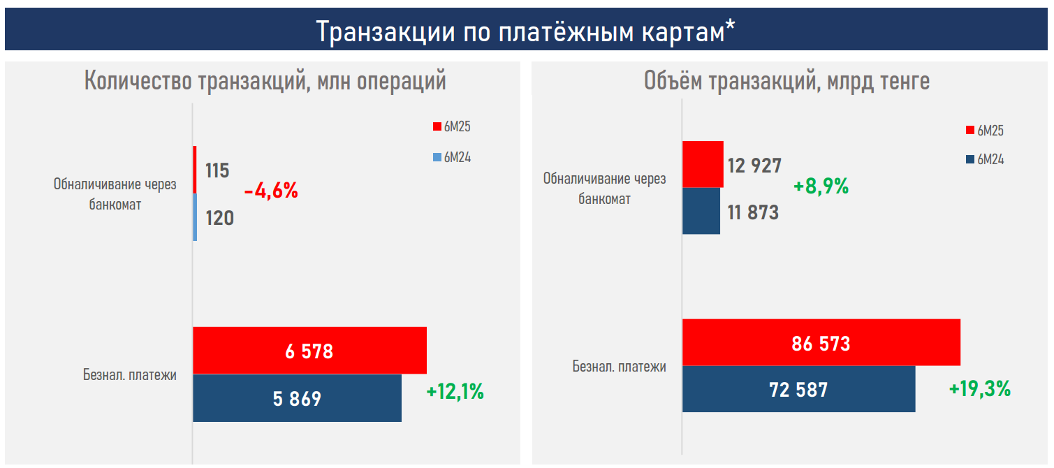 - На фоне общего роста платёжной активности наблюдается умеренная ребалансировка в пользу локальных платёжных систем: количество карт платёжных систем РК выросло на 6,1% (до 27,4 млн), что согласуется с глобальным трендом на национальную платёжную независимость.