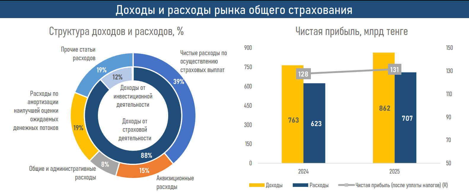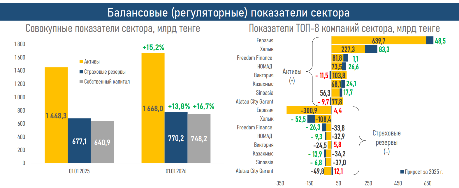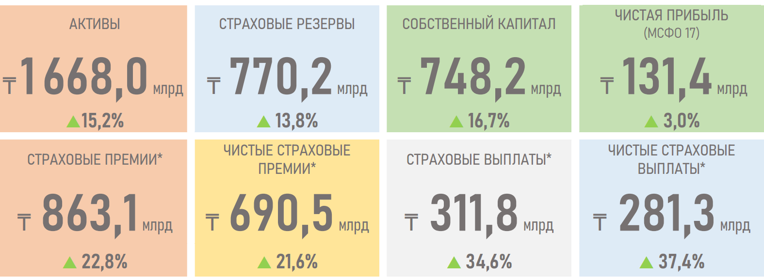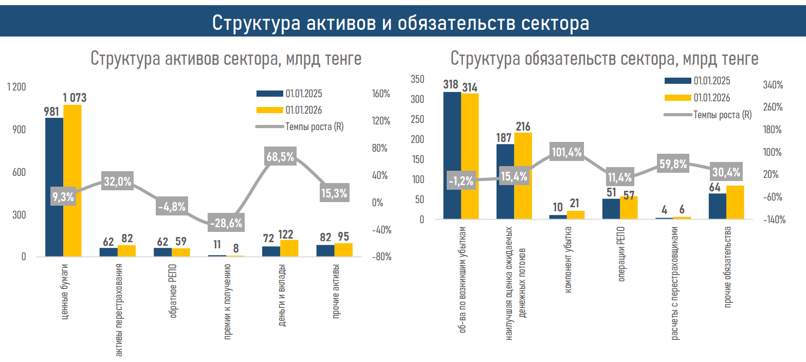 - По итогам 2025 года активы компаний общего страхования (КОС) выросли на 15,2% против более скромного увеличения на 5,2% годом ранее. Такая динамика была обеспечена прежде всего операционными факторами — ростом страховых премий (+₸160 млрд) и существенным улучшением результата страховой деятельности (+₸154 млрд).