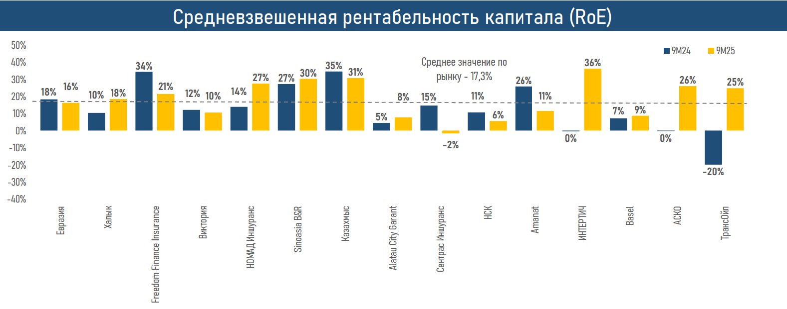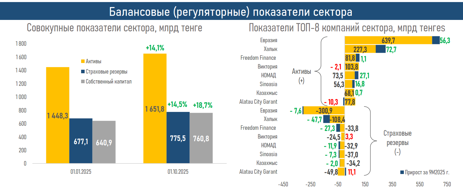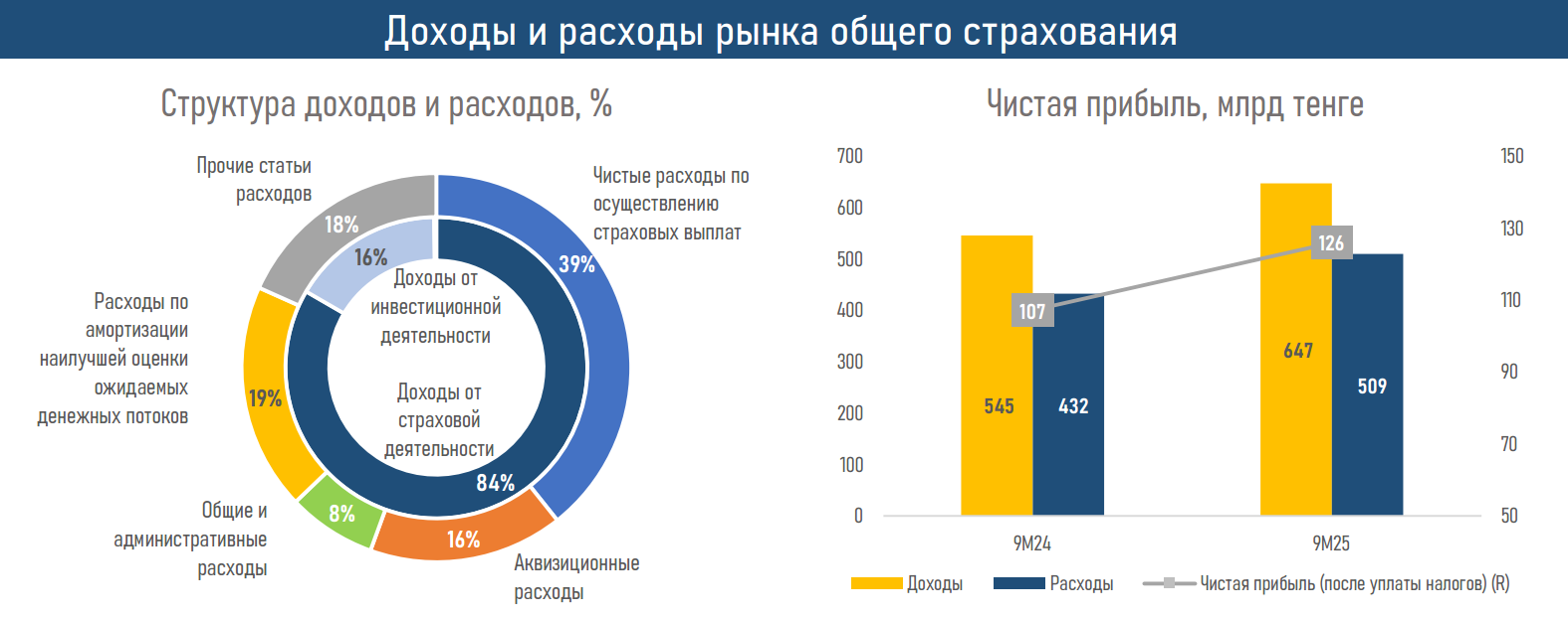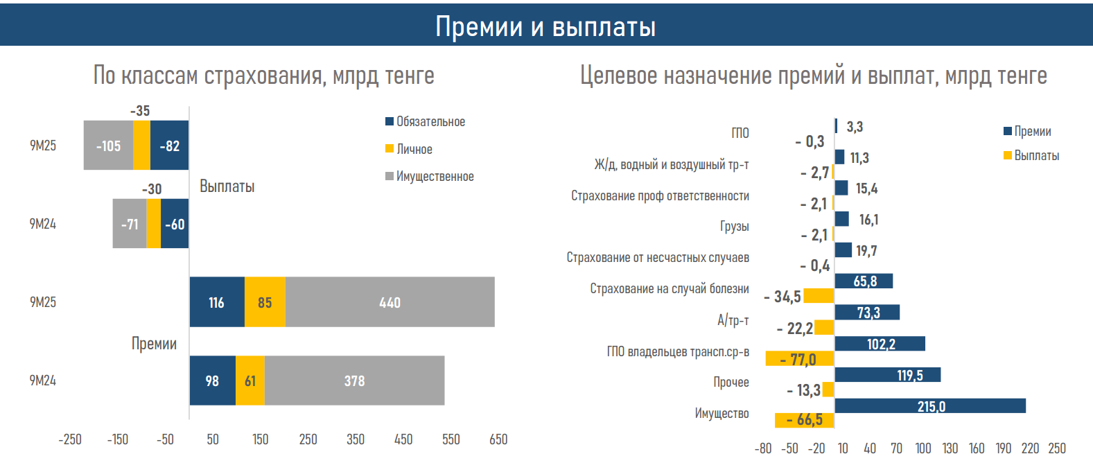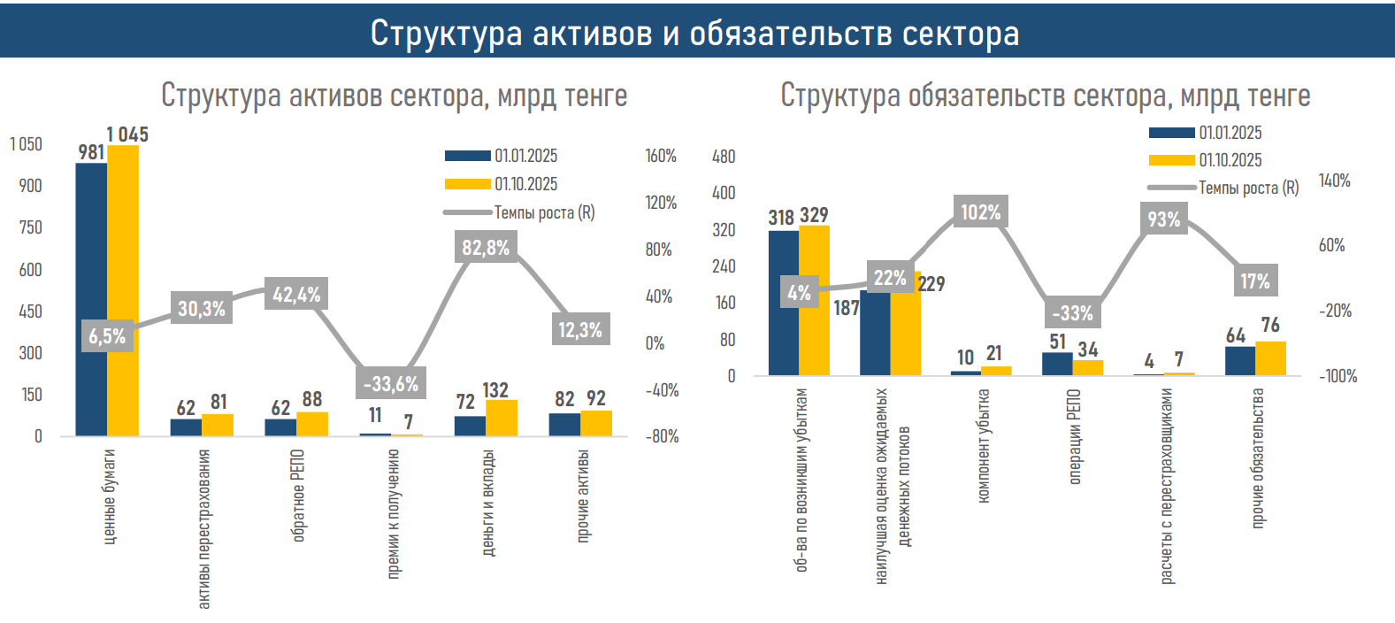 - За январь — сентябрь 2025 года активы компаний общего страхования (КОС) выросли на 14,1%, против скромного роста на 1,1% годом ранее. Основным фактором выступил более высокий объем страховых премий (+₸105 млрд) по сравнению со страховыми выплатами (+₸61 млрд), а также существенное улучшение доходности страховой деятельности (+91,6%) и рост инвестиционных доходов (+10,4%).