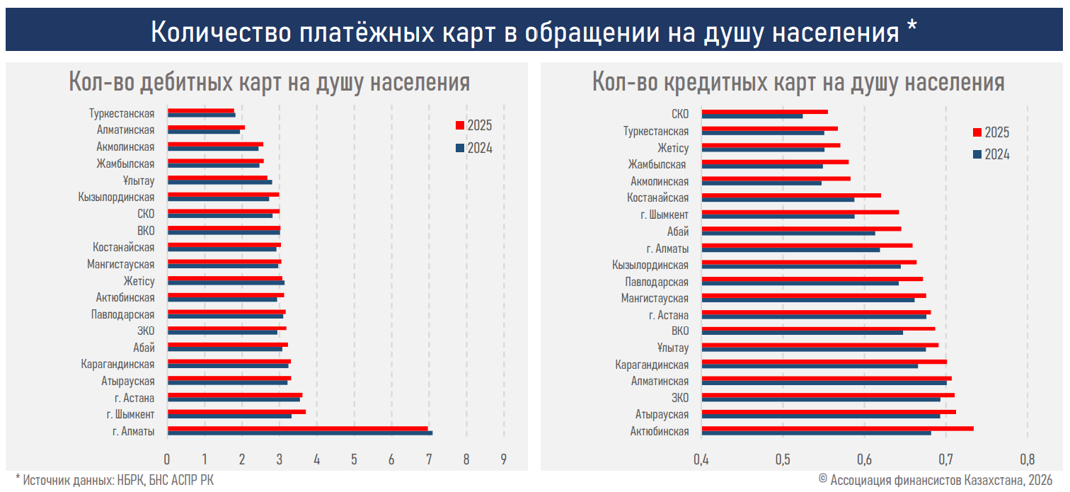 В региональном разрезе лидерами прироста доли безналичных транзакций в 2025 году стали такие регионы как Ұлытау (+3,4 п.п), Акмолинская область (+3,2 п.п.) и Жетісу (+2,7 п.п.). Это указывает на постепенное выравнивание уровня проникновения безналичных платежей по стране, тогда как в крупнейших городах рынок уже близок к насыщению. В результате рост доли безналичных операций становится более равномерным по стране, а его дальнейшее расширение может быть в большей степени связано с увеличением частоты, объёма операций внутри уже сформированной цифровой среды и общей динамикой экономической активности.