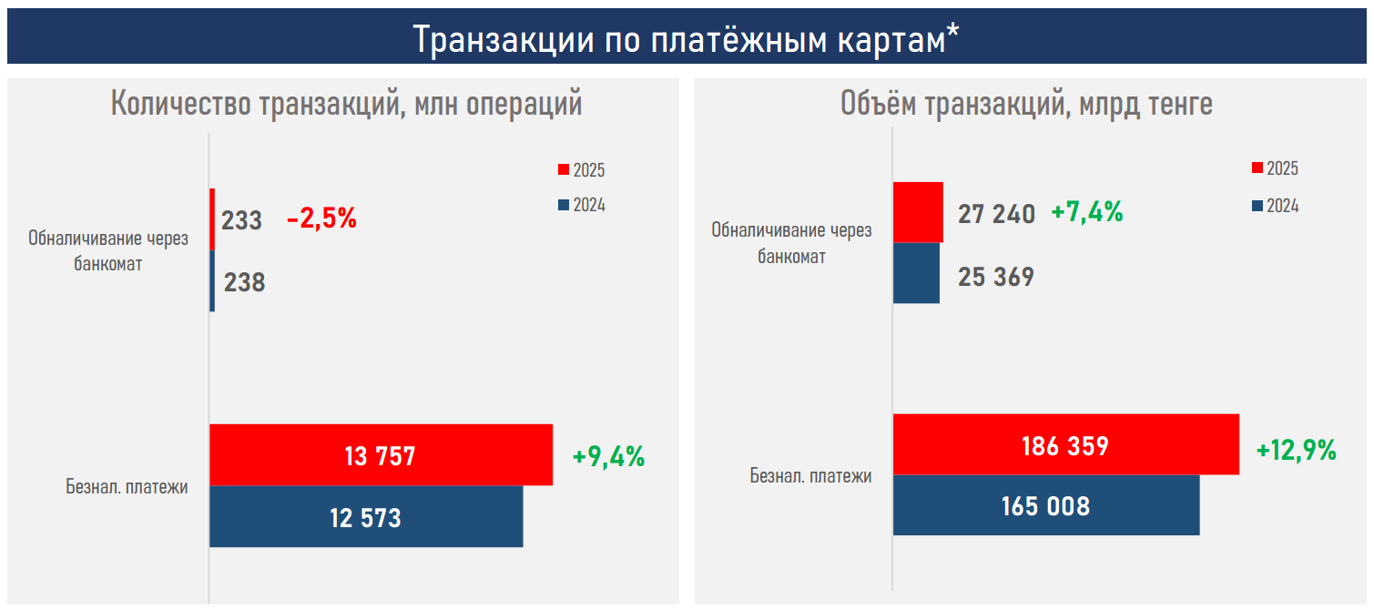 - По итогам 2025 года объём безналичных карточных транзакций в стране достиг ₸186 трлн (+13% г/г), что эквивалентно 187% к ВВП.