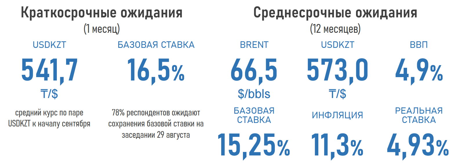 - В краткосрочной перспективе эксперты пока не видят срочной необходимости в повышении базовой ставки. 78% опрошенных аналитиков прогнозируют ее сохранение на предстоящем заседании НБРК в пятницу, 29 августа, на фоне замедления месячного роста ИПЦ пять месяцев подряд. Остальные 22% допускают её повышение до 16,75–17%.