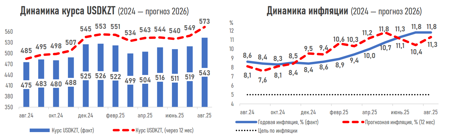 - Пересмотр курсовых ожиданий сопровождался ухудшением восприятия инфляционных рисков: в августе годовые инфляционные ожидания выросли до 11,3% против 10,4% месяцем ранее, что отражает опасения относительно ускорения роста цен на фоне увеличения налоговой нагрузки, переноса увеличившихся издержек бизнеса (транспорт, логистика, сырьё) на конечных потребителей и неизбежного последующего удорожания импортных товаров в результате ослабления тенге.