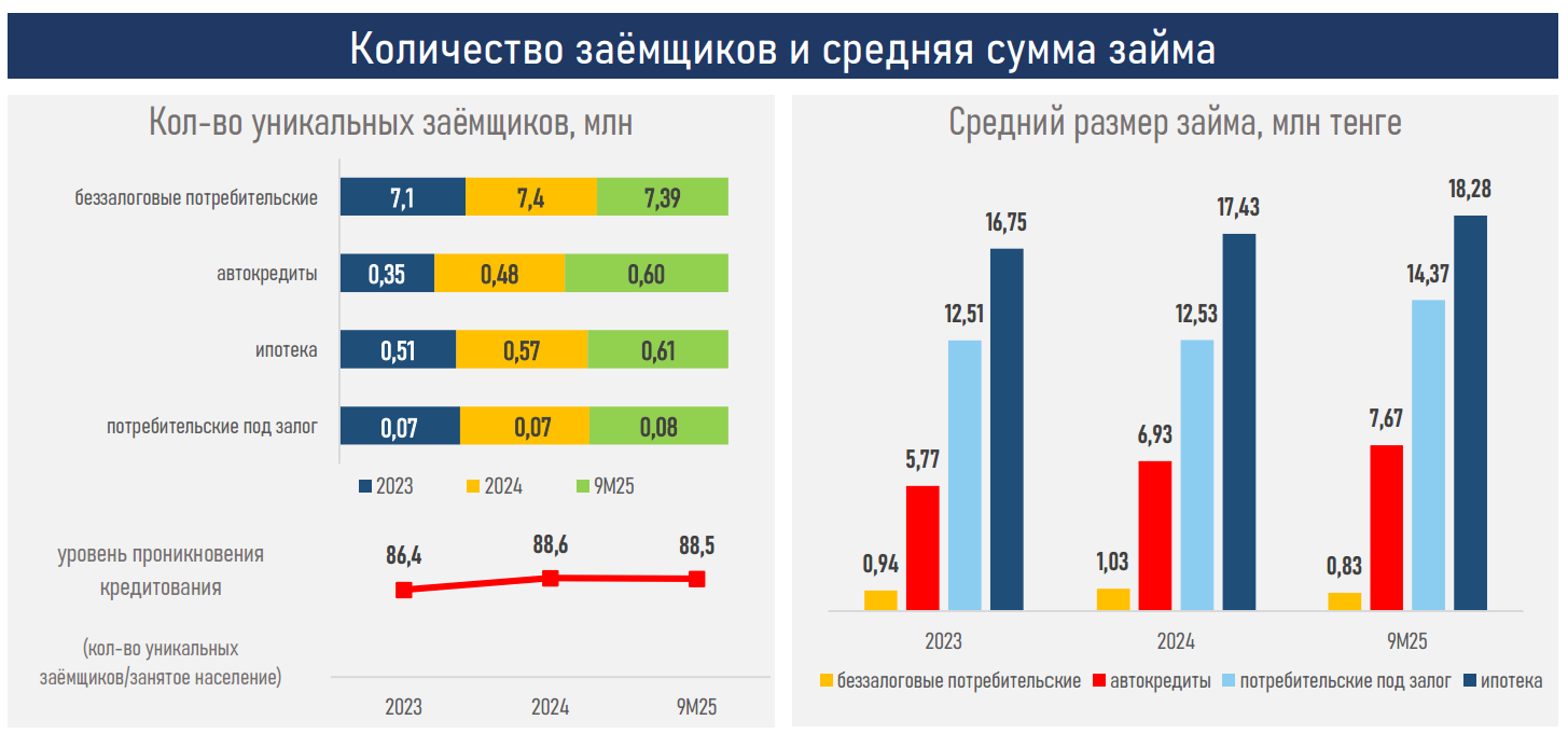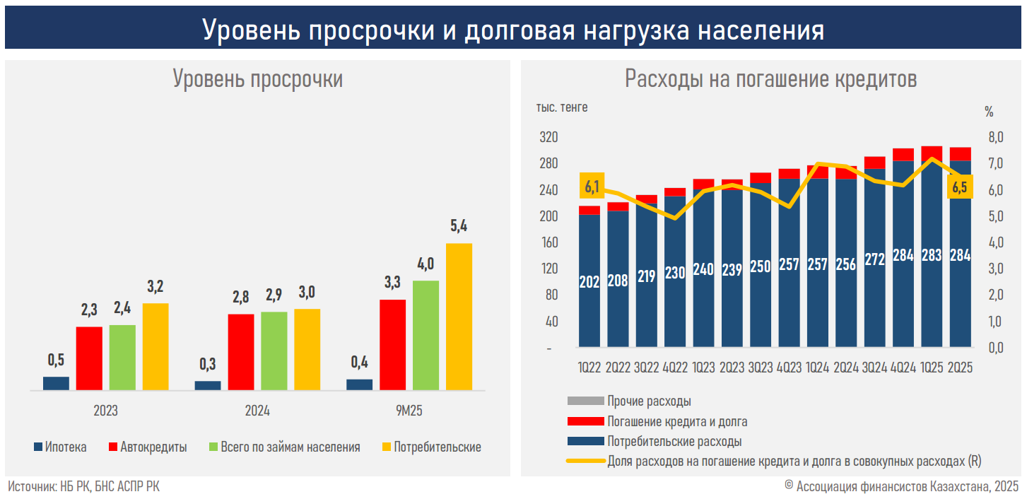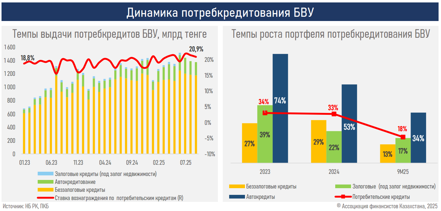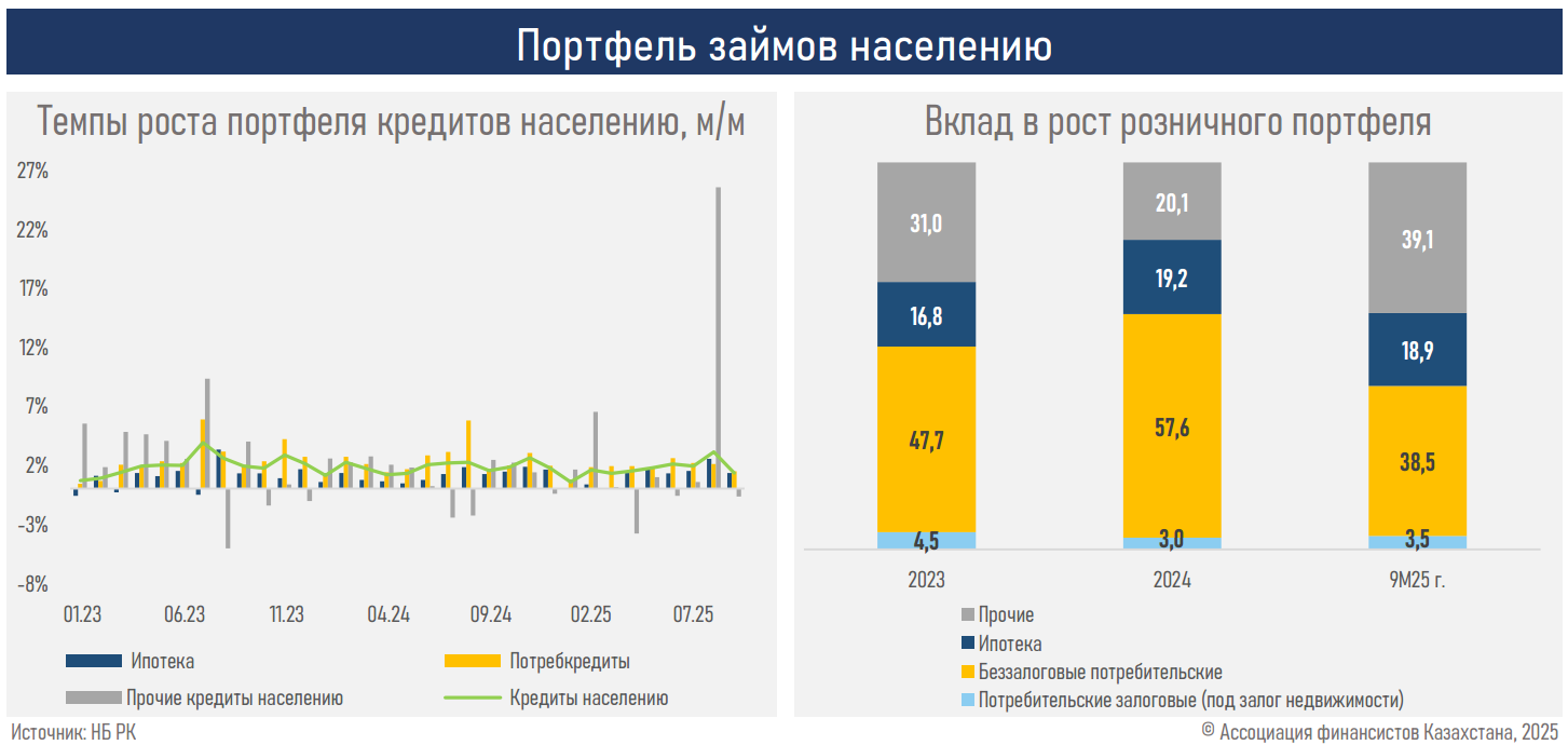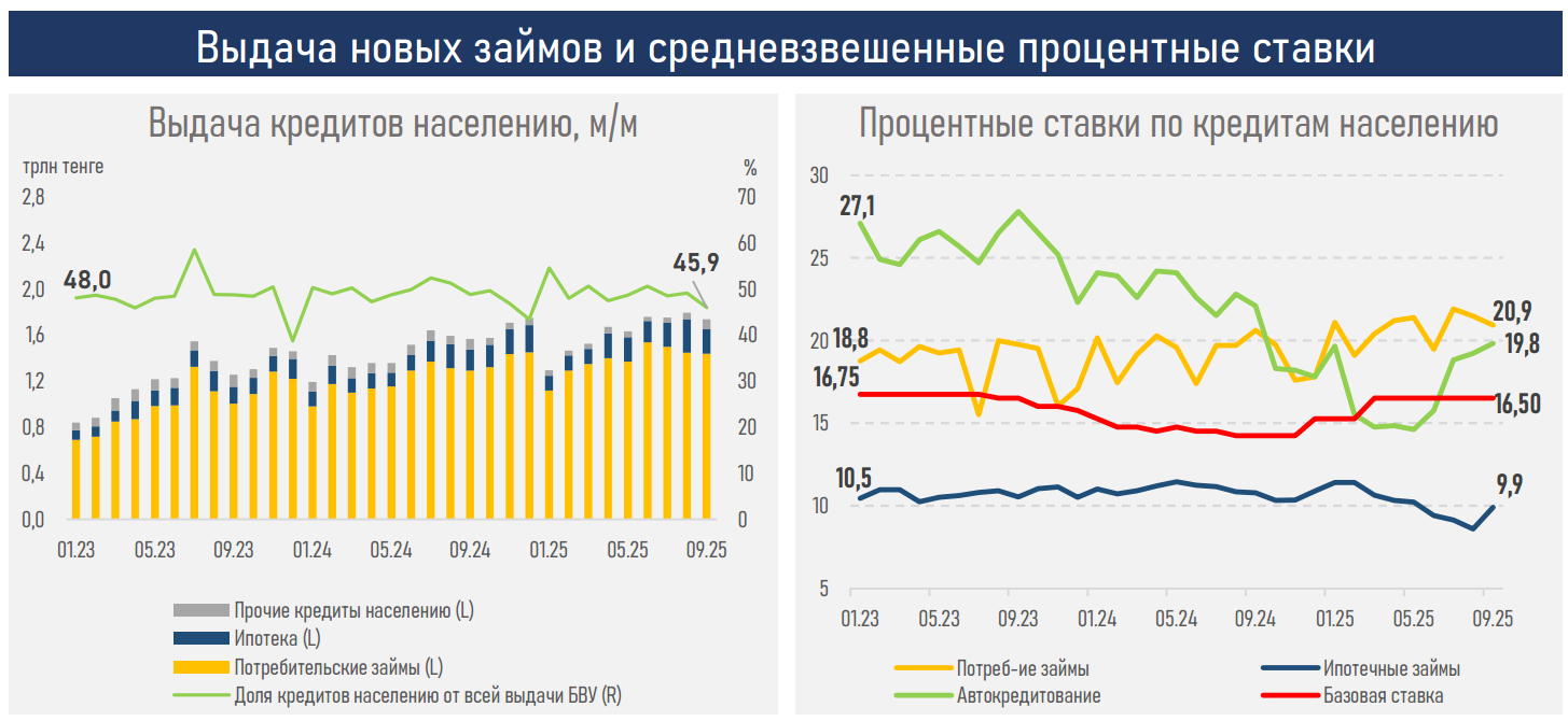 За январь-сентябрь 2025 года прирост новых выдач в розничном сегменте замедлился почти вдвое — до 12,8% против 23,3% годом ранее, что отражает охлаждение спроса на беззалоговые займы на фоне высокой базовой ставки, ужесточения макропруденциальных требований, снижения реальных доходов казахстанцев и эффекта насыщения рынка.