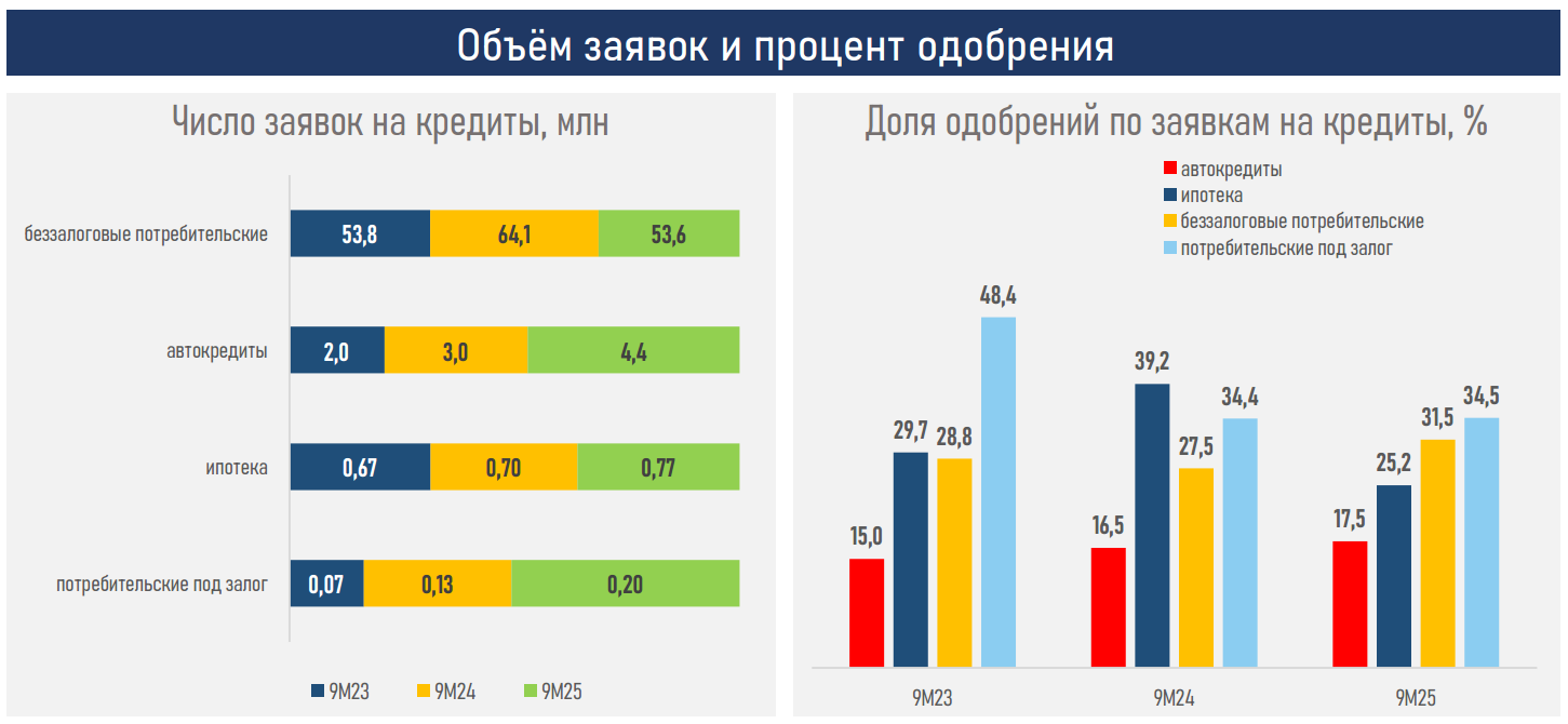 - Снижение зафиксировано в ключевом сегменте беззалоговых займов (−16,4% г/г), тогда как во всех остальных сегментах наблюдалось увеличение спроса: в ипотеке (+10,2% г/г), автокредитах (+48,0%), потребительских займах под залог недвижимости (+54,5%).