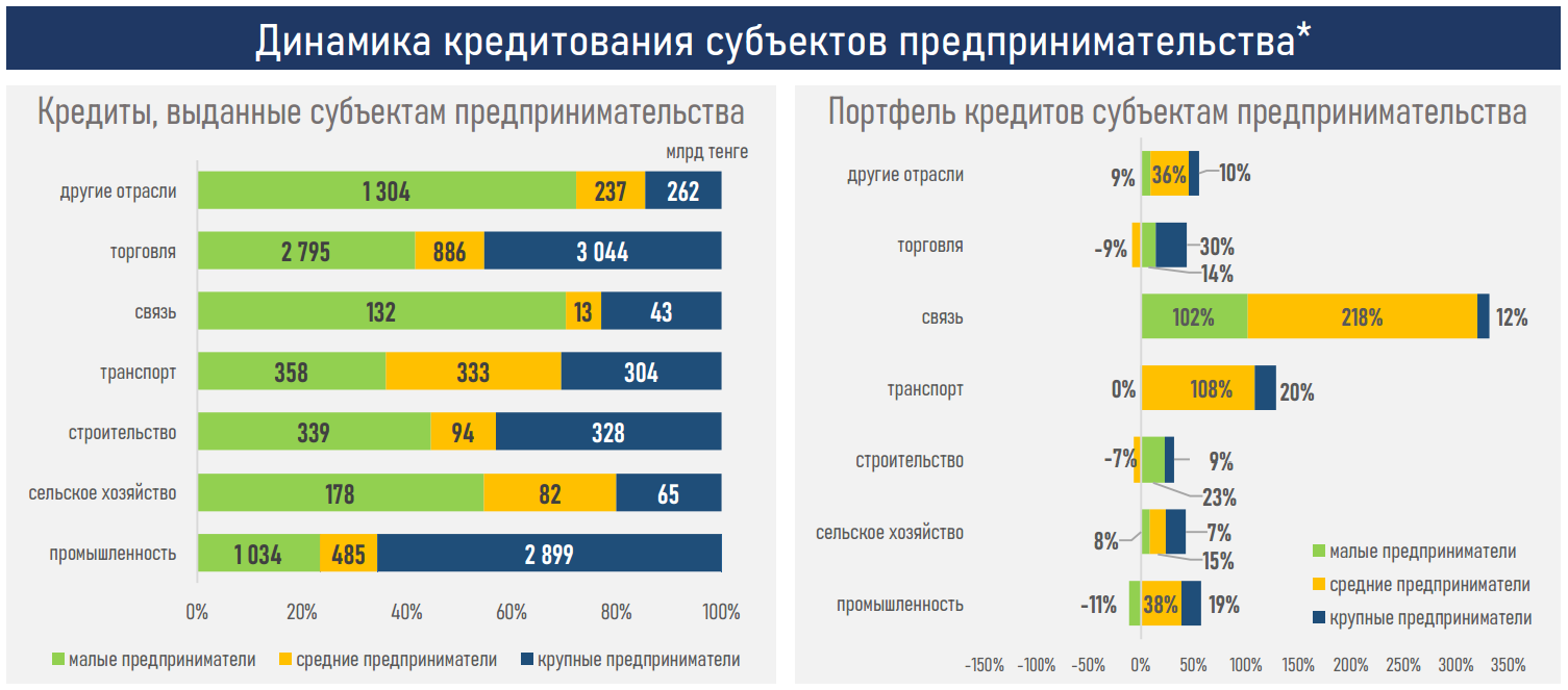 - Дивергенция в динамике кредитования может быть связана c более медленным ростом ставок у представителей среднего и крупного бизнеса (+85 и 128 б.п., соответственно), более высокой конверсией заявок (доля одобренных заявок традиционно выше у среднего и крупного бизнеса), реализацией инфраструктурных и инвестиционных проектов, доступности льготного финансирования через программы «Өрлеу» и портфельного гарантирования «Даму».