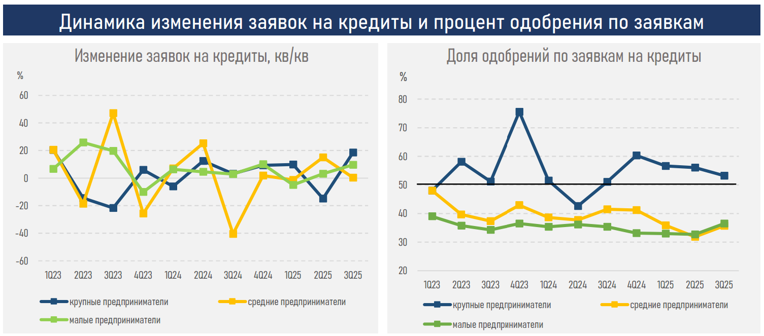 На стороне МСБ сохраняется интерес к более длинным займам благодаря расширению доступа к льготным инструментам. Эти программы смягчают влияние от повышения ставок и позволяют МСБ привлекать ресурсы для оборотного капитала, инвестиций и обновления основных средств, несмотря на более высокую чувствительность к стоимости заимствований.
