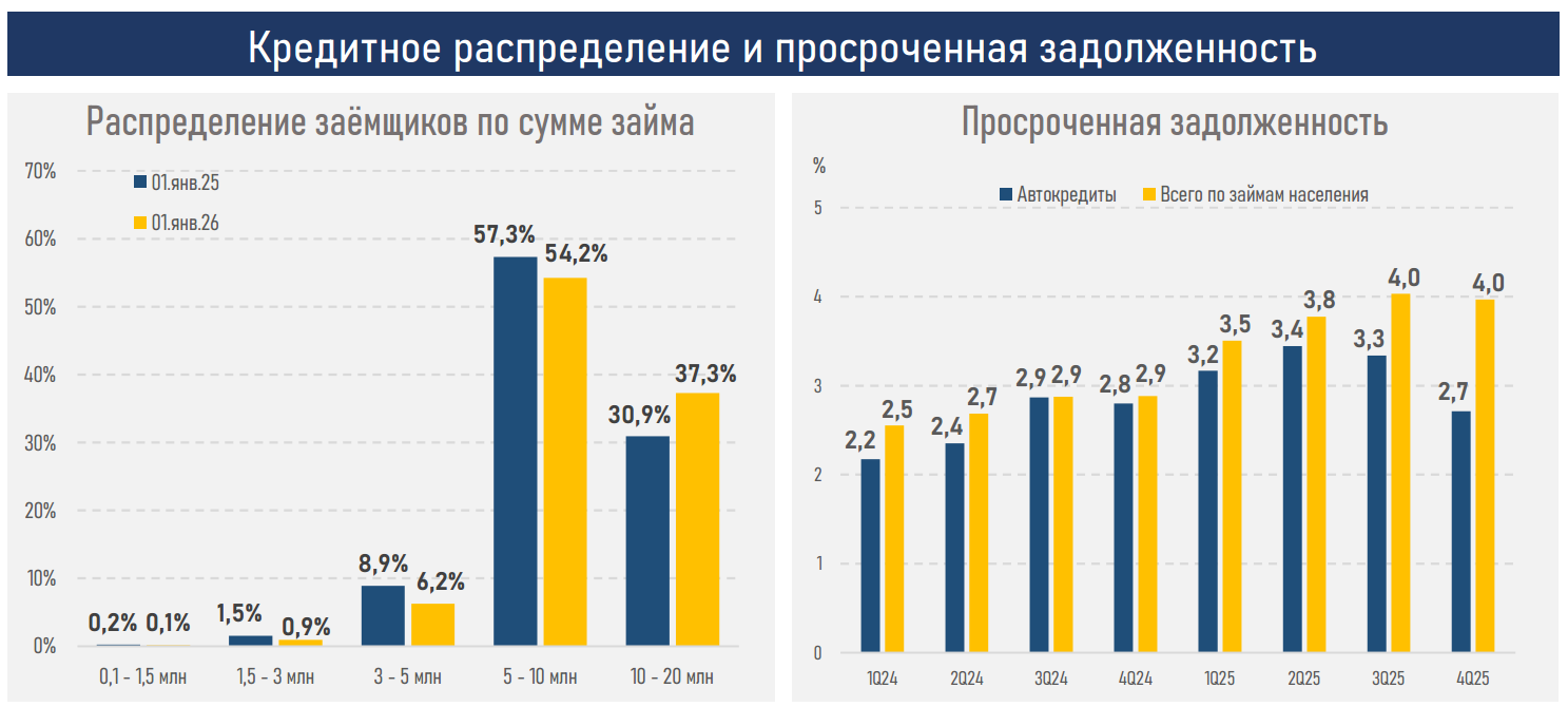 - Быстрый рост выдач и портфеля (+42%) сопровождался сохранением относительно благоприятных параметров риска. Доля просроченной задолженности по автокредитам по итогам года снизилась (с 2,8% до 2,7%) и сохранялась ниже среднего уровня по розничному сегменту (4,0%), что объясняется обеспеченным характером продукта и более строгими критериями отбора заёмщиков.