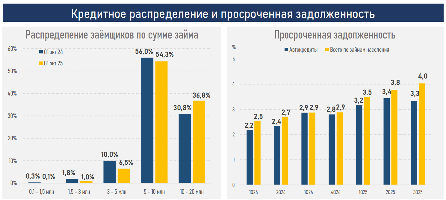 - Отметим, что доля просроченной задолженности по автокредитам (3,3%) остаётся ниже среднего уровня по розничному кредитованию (4,0%). Это отражает более качественный состав заёмщиков в автосегменте и залоговую природу продукта, которая дисциплинирует обслуживание долга и снижает вероятность дефолта.