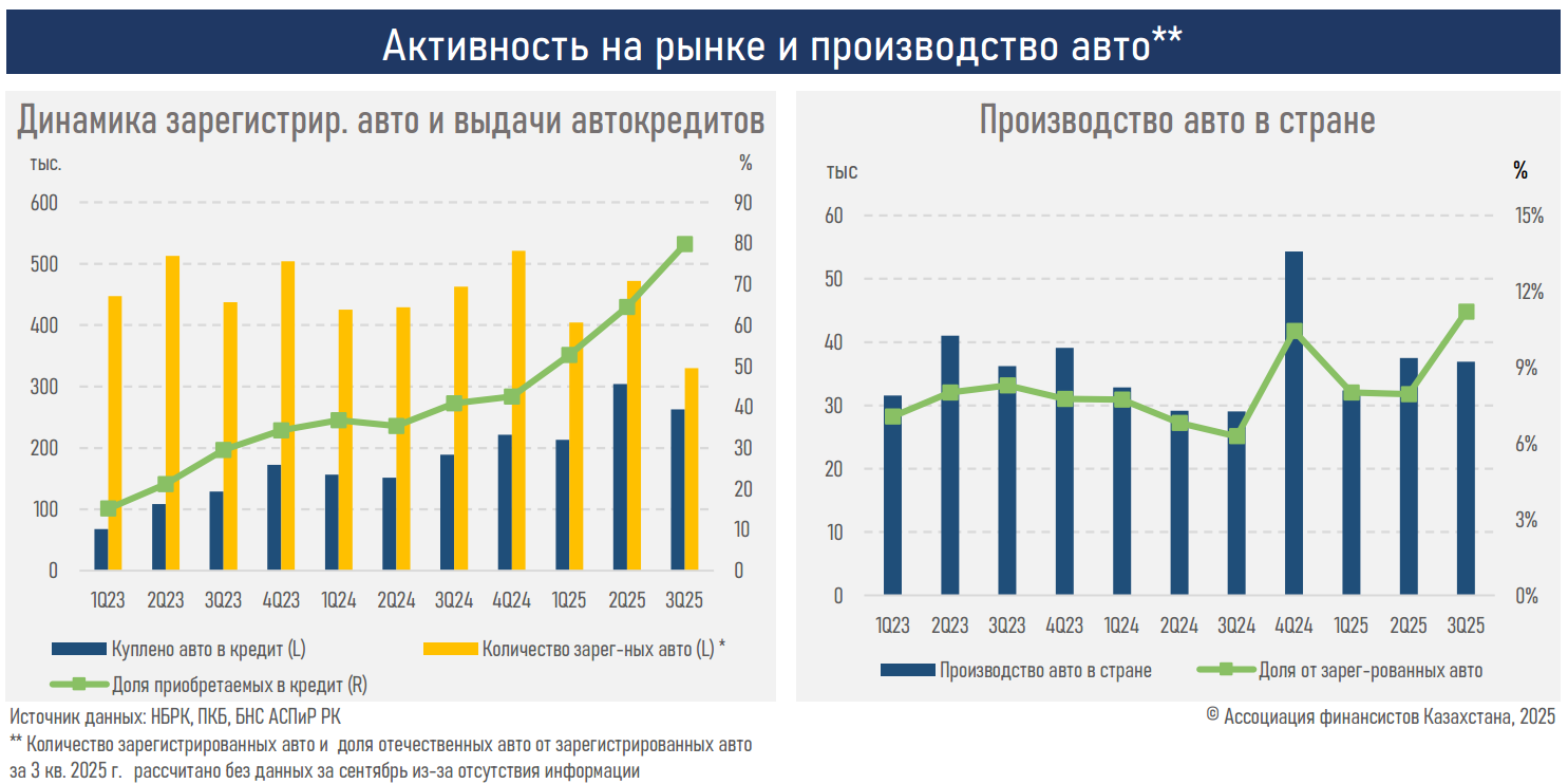 - Дополнительную поддержку автокредитованию оказывает производственный фактор. Выпуск автомобилей в стране за 9М25 г. увеличился до 106,7 тыс. единиц (91,0 тыс. за 9М24 г.). В результате доля произведённых в РК авто в общем количестве зарегистрированных машин выросла до 11% с 6% ранее.