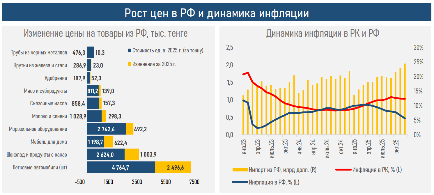 - В краткосрочной перспективе данные дисбалансы, вероятно, сохранятся. Ослабление рубля к тенге (-6,5% c н.г.) будет поддерживать ценовое преимущество российских товаров. При этом без реализации мер по диверсификации экономики и развитию внутреннего производства зависимость от импорта останется высокой, продолжая оказывать давление на торговый баланс, инфляцию и валютный рынок.