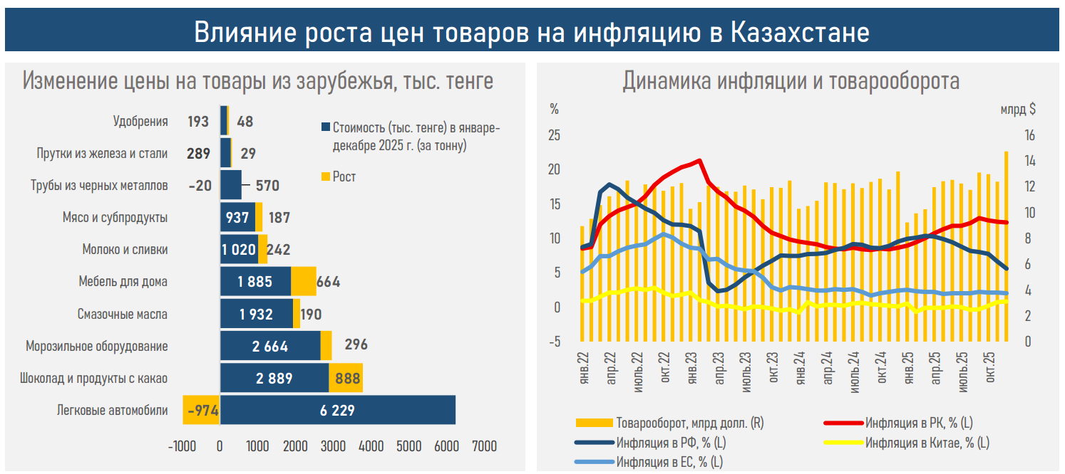 - При этом общий уровень инфляции у торговых партнёров оставался ниже, чем в Казахстане (см. ниже). Несмотря на умеренную общую инфляцию за рубежом, именно подорожание отдельных товарных категорий формировало давление на внутренние цены через канал импорта.