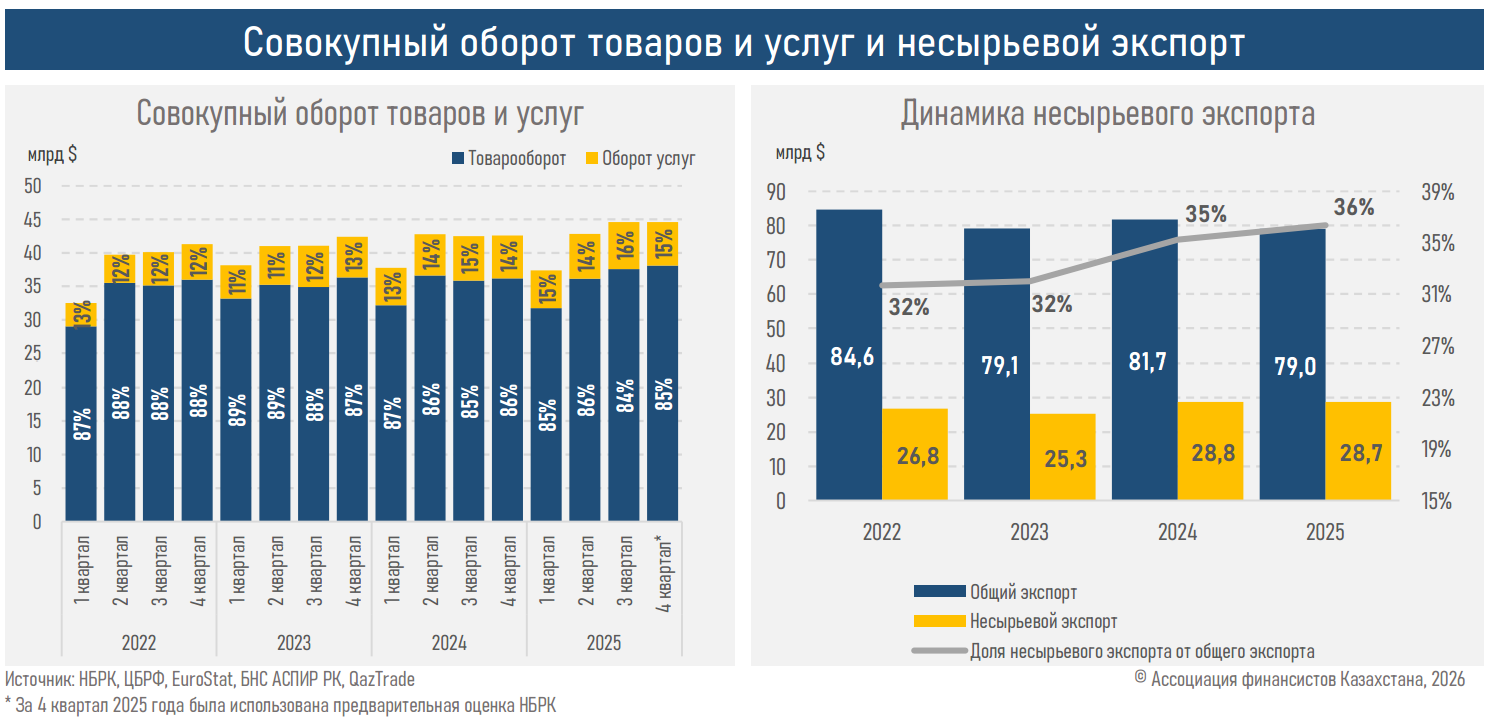 По прогнозам правительства, в 2026 году экспорт может уменьшиться до $77,1 млрд, тогда как импорт, наоборот, повысится до $67,7 млрд. В этом случае профицит торгового баланса снизится до $9,4 млрд, что означает его сокращение ещё на треть по сравнению с уровнем 2025 года. Подобная траектория указывает на дальнейшее ослабление внешней позиции, рост давления на валютный рынок и потенциальное увеличение нагрузки на международные резервы Национального Банка при неблагоприятной внешней конъюнктуре.