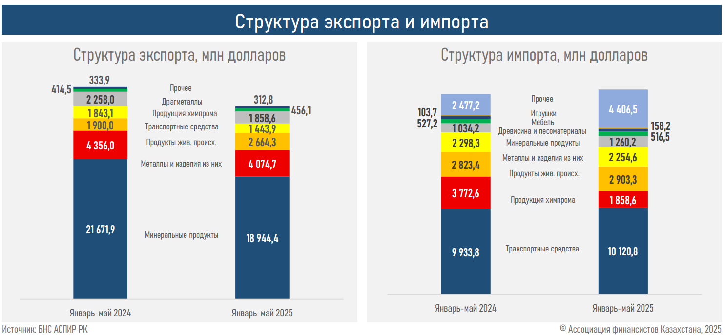 Аналитический центр АФК представляет вашему вниманию обзор товарооборота Казахстана за январь - май 2025 года.