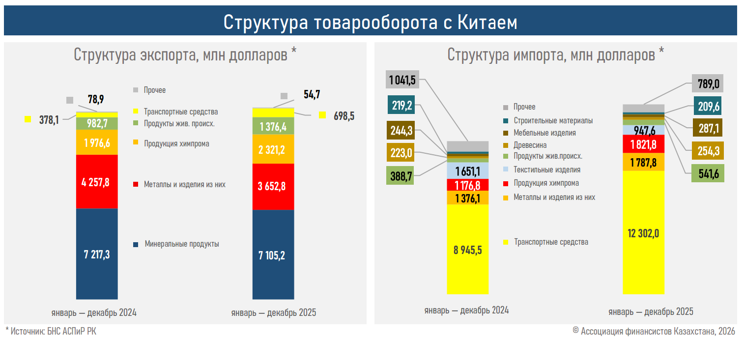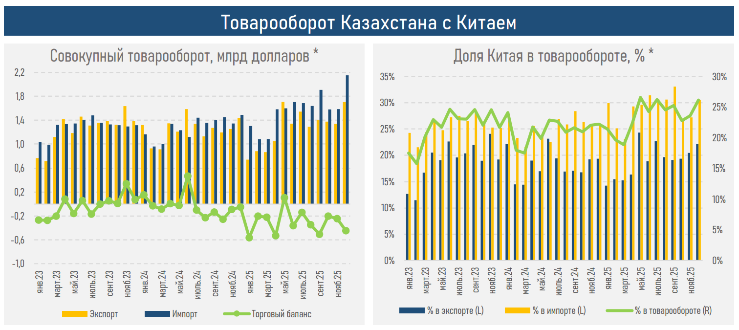 По итогам 2025 года двусторонняя торговля с Китаем достигла $34,1 млрд, что сопоставимо примерно с 11,2% ВВП Казахстана и подчёркивает важную роль Китая во внешнеэкономической деятельности страны. При этом динамика торговли всё более определяется импортными поставками готовой продукции и товаров более высокой степени переработки, усиливая зависимость внутреннего рынка от внешних поставок.