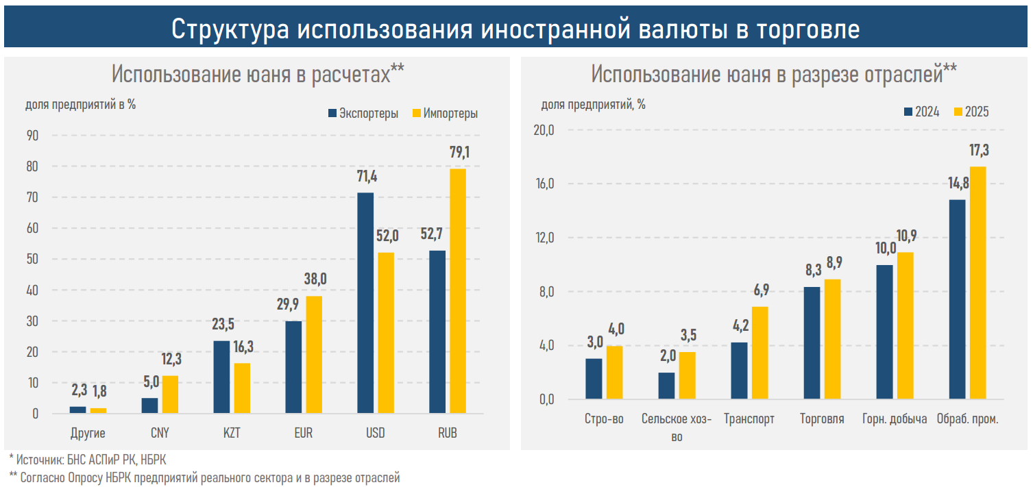 • Изменения затрагивают и валютную структуру расчётов (см. ниже). Наблюдается постепенное расширение использования китайского юаня, прежде всего в импортных операциях на фоне диверсификации валютных расчётов, роста ликвидности в юанях (на KASE объём торгов парой CNYKZT вырос на 240%), стремления компаний снизить транзакционные издержки.