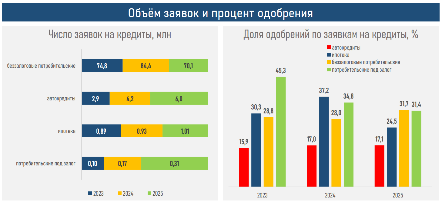Розничный кредитный рынок в 2025 году перешёл в фазу замедления после периода активного роста. Количество заявок на займы сократилось на 13,7% г/г, приток новых клиентов замедлился почти в три раза (163 тыс. против 487 тыс. годом ранее), а темпы роста выдачи новых кредитов — в 2,5 раза, до 8,7% с 21,9%.
