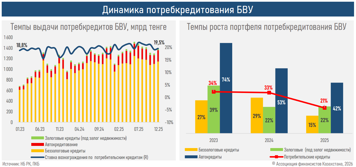 - В то же время в остальных сегментах сохранялась положительная динамика — в ипотеке (+9,2% г/г), автокредитовании (+41,8% г/г) и потребительских кредитах под залог (+77,1% г/г), указывающая на перераспределение спроса в пользу обеспеченных продуктов.